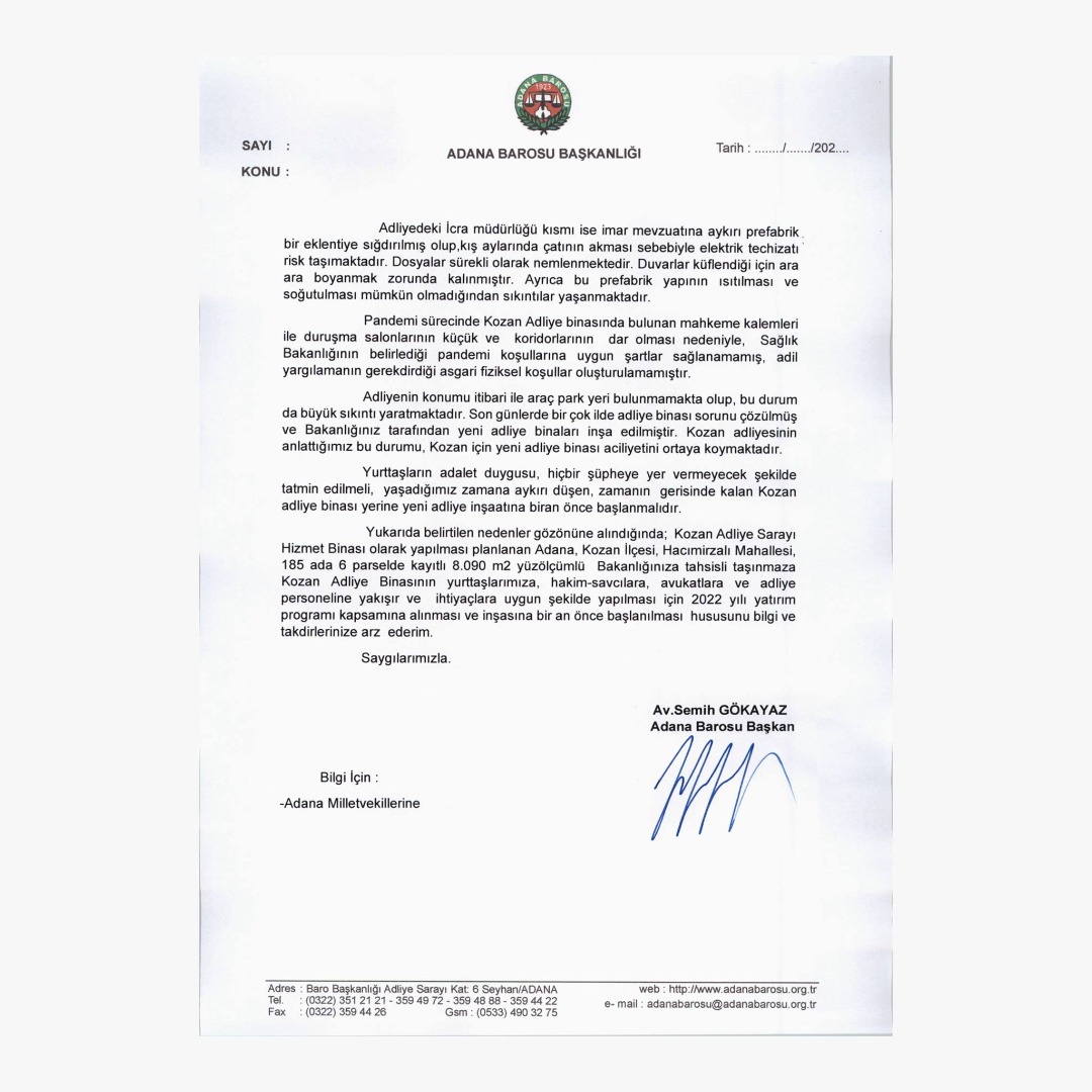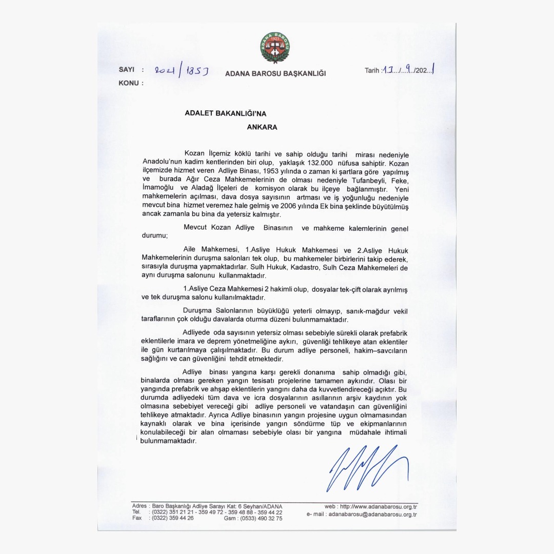 Kozan’a yeni adliye yapılması ve inşasının 2022 yılı yatırım programına alınması için Adalet Bakanlığından 13.09.2021 tarihli yazımızda talepte bulunmuştuk. O yazı ekte sunulmuştur.